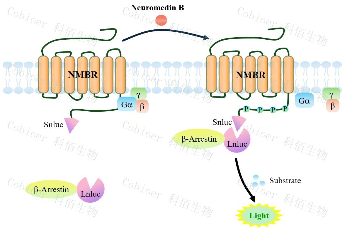 NMBR(BB1) β-Arrestin CHO 報(bào)告基因藥靶模型很好的模擬了體內(nèi) NMBR/β-Arrestin 的信號轉(zhuǎn)導(dǎo)過程,原理見下圖所示。當(dāng)缺乏配體刺激時(shí),β-Arrestin 不與 NMBR 結(jié)合,融合β- Arrestin 的熒光素酶處于失活構(gòu)象,當(dāng) NMBR 遭遇配體刺激時(shí),融合熒光素酶報(bào)告基因的 β-Arrestin 被招募,使熒光素酶報(bào)告基因處于激活狀態(tài),加入其底物后發(fā)光信號增強(qiáng)。![]() Figure 1. NMBR(BB1) β-Arrestin CHO 細(xì)胞模型原理圖 |