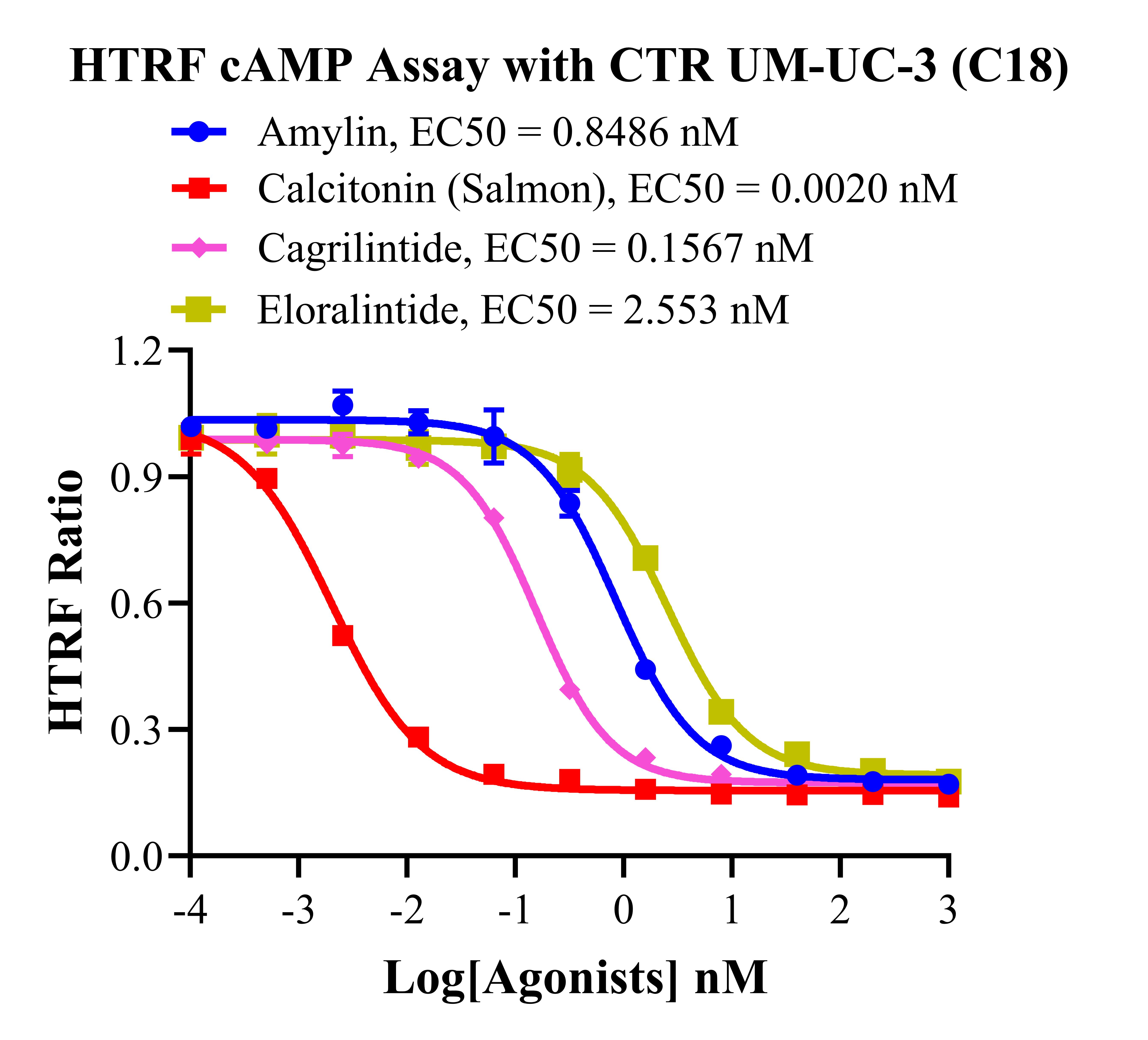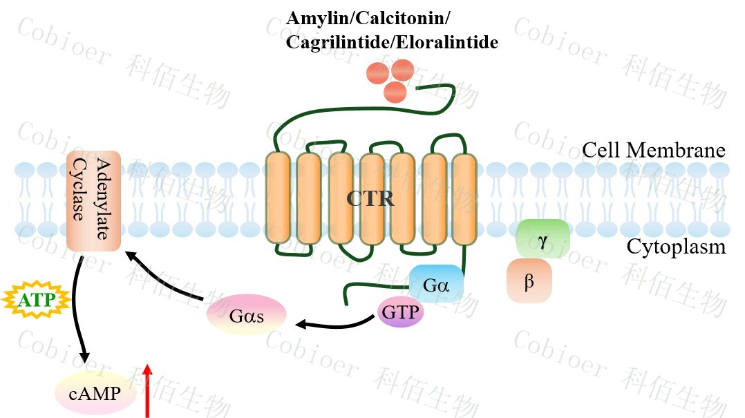 | 降鈣素基因相關(guān)肽(CGRP)家族包括 CGRP 本身、降鈣素(CT)、腎上腺髓質(zhì)素 (AM)和胰島淀粉樣肽(AMY)。 胰淀素(Amylin)受體的三種類(lèi)型的已被確定,即 AMY1,AMY2 和 AMY3。胰淀素 受體屬于 B 類(lèi) GPCR,是異二聚體復(fù)合物,由降鈣素受體(CTR)與受體活性修飾蛋白 (RAMPs)結(jié)合形成。該受體的 CTR 組分具有相同的 GPCR 結(jié)構(gòu):7 個(gè)跨膜相互連接的α- 螺旋,將細(xì)胞外信號(hào)傳遞到細(xì)胞內(nèi)細(xì)胞質(zhì)信號(hào)級(jí)聯(lián)。RAMP 有三種類(lèi)型(RAMP1、 RAMP2 和 RAMP3),它們共享 31%的氨基酸序列,具有相似的基本結(jié)構(gòu)。RAMP 是將 CTR 轉(zhuǎn)運(yùn)到細(xì)胞膜并調(diào)節(jié)其配體特異性的重要肽,它可以改變特定 GPCR 的藥理學(xué)、功能 和細(xì)胞運(yùn)輸。 哺乳動(dòng)物細(xì)胞中 Amylin 受體的激活已被證明可以提高 cAMP,并被認(rèn)為與 Gs 蛋白和 腺苷酸環(huán)化酶的刺激有關(guān)。在 RAMPs 的存在下,其與胰淀素的結(jié)合親和力可以被修飾。 CTR 和 RAMP1 或 CTR 和 RAMP3 的異質(zhì)結(jié)構(gòu)被認(rèn)為有利于與胰淀素結(jié)合,介導(dǎo)大腦中的 生理功能。AMY3 的激活刺激 G 蛋白 Gαs,進(jìn)一步控制腺苷酸環(huán)化酶(AC),隨后增加細(xì) 胞 cAMP。cAMP 與 PKA 調(diào)控亞基(R2)的結(jié)合誘導(dǎo) PKA 四聚體全酶解離,導(dǎo)致 PKA 催 化亞基的激活。cAMP 激活的 PKA 參與調(diào)控 ERK1/2 的活性。ERK1/2 通路的觸發(fā)可能導(dǎo)致 Ca 2+分布不均勻,引發(fā)內(nèi)質(zhì)網(wǎng)和線(xiàn)粒體功能障礙,導(dǎo)致細(xì)胞死亡。此外,cAMP 刺激 AKT 進(jìn)一步導(dǎo)致轉(zhuǎn)錄因子 cFos 的表達(dá)。 |