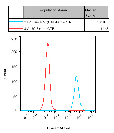 CTR UM-UC-3 細(xì)胞藥靶模型很好的模擬了體內(nèi) CTR 的信號(hào)轉(zhuǎn)導(dǎo)過(guò)程,原理見(jiàn)下圖所示。![]() Figure 1. CTR UM-UC-3 細(xì)胞模型原理圖 |