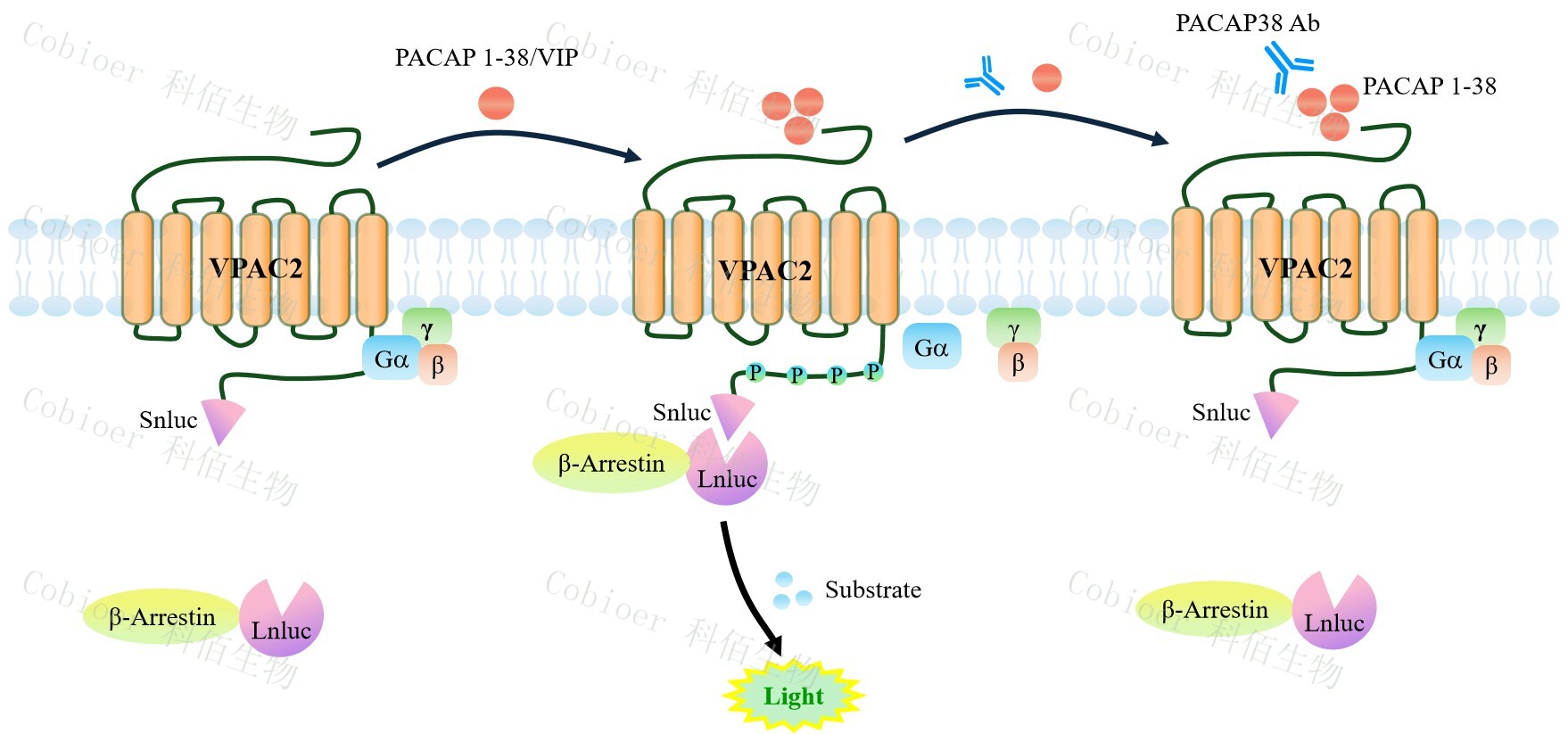 VPAC2 β-Arrestin CHO 報告基因藥靶模型很好的模擬了體內(nèi) VPAC2/β-Arrestin 的信號轉(zhuǎn)導(dǎo)過程,原理見下圖所示。當缺乏配體刺激時,β-Arrestin 不與 VPAC2 結(jié)合,融合β- Arrestin 的熒光素酶處于失活構(gòu)象,當 VPAC2 遭遇配體刺激時,融合熒光素酶報告基因的 β-Arrestin 被招募,使熒光素酶報告基因處于激活狀態(tài),加入其底物后發(fā)光信號增強。![]() Figure 1. VPAC2 β-Arrestin CHO 細胞模型原理圖 |