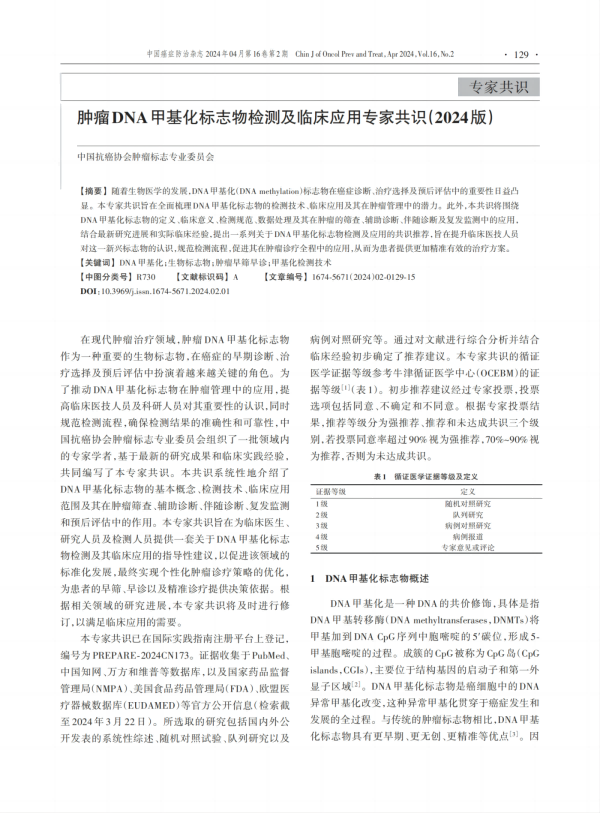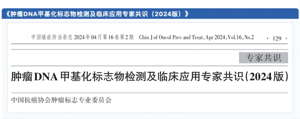2024年4月,《腫瘤DNA甲基化標志物檢測及臨床應(yīng)用專家共識》于中國癌癥防治雜志重磅發(fā)布。