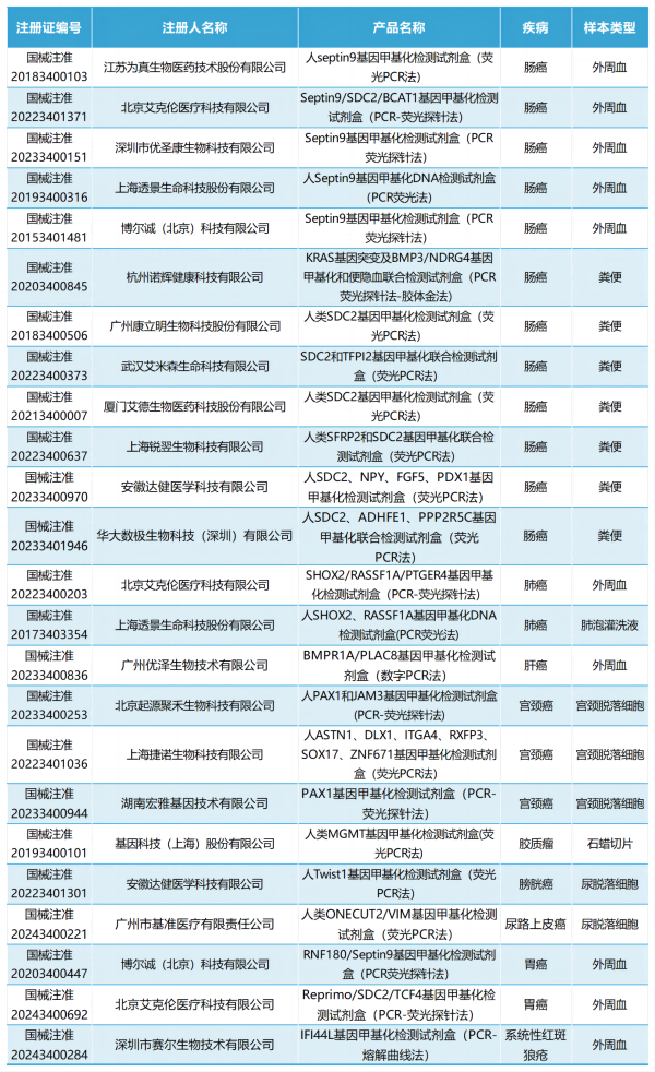 截至目前,已有24款甲基化檢測相關(guān)試劑盒獲批,具體如下: